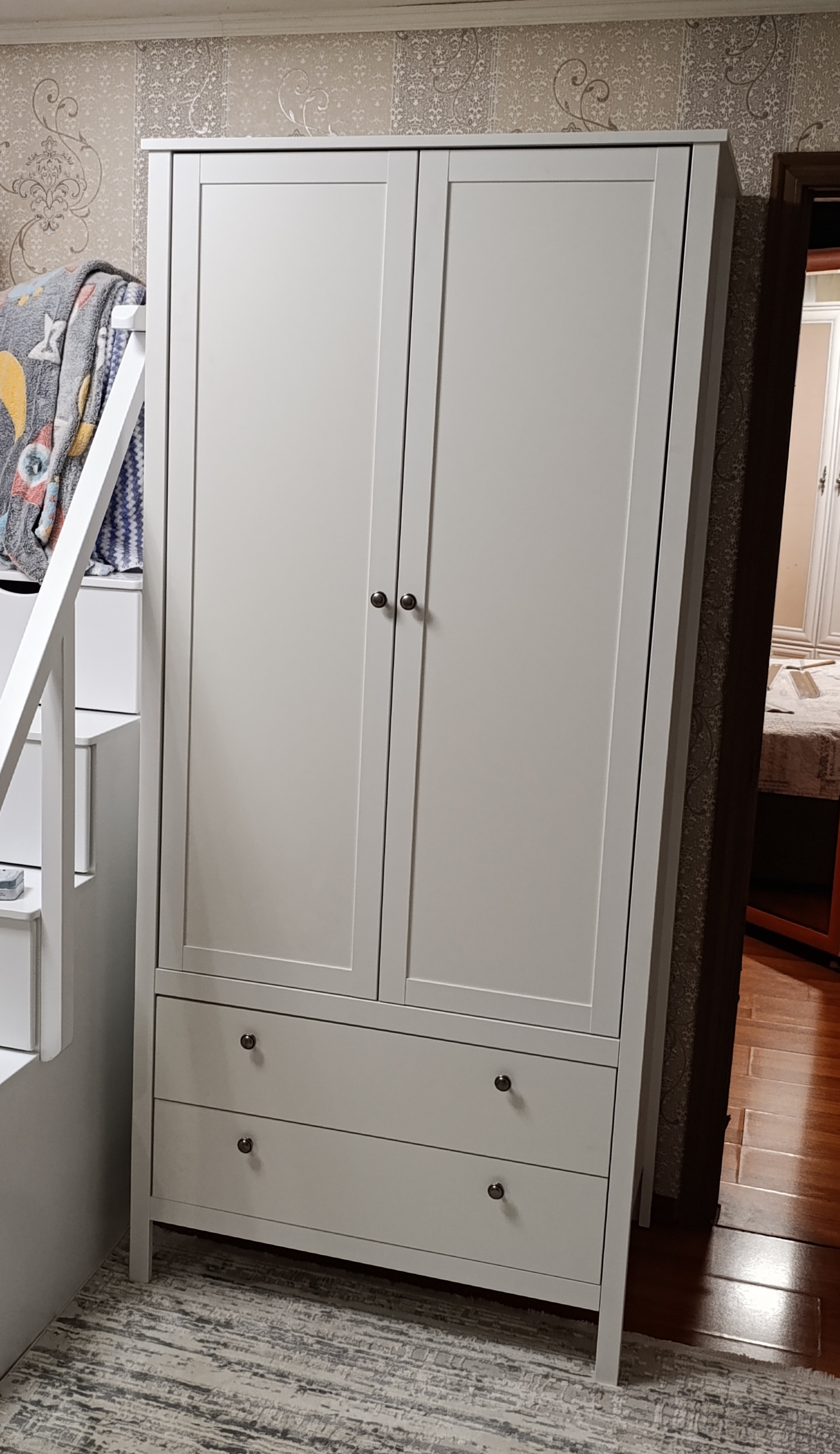 - распашные глухие двери, за которыми расположена стационарная штанга для одежды