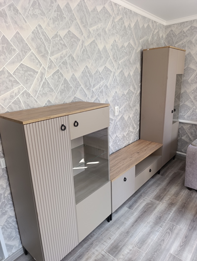 Благодаря необычному сочетанию рифленой и гладкой поверхностей на фасадах, черным матовым ручкам в форме кольца, а также высоким ножкам, коллекция станет ярким акцентом и соберет восторженные взгляды всех ваших гостей.