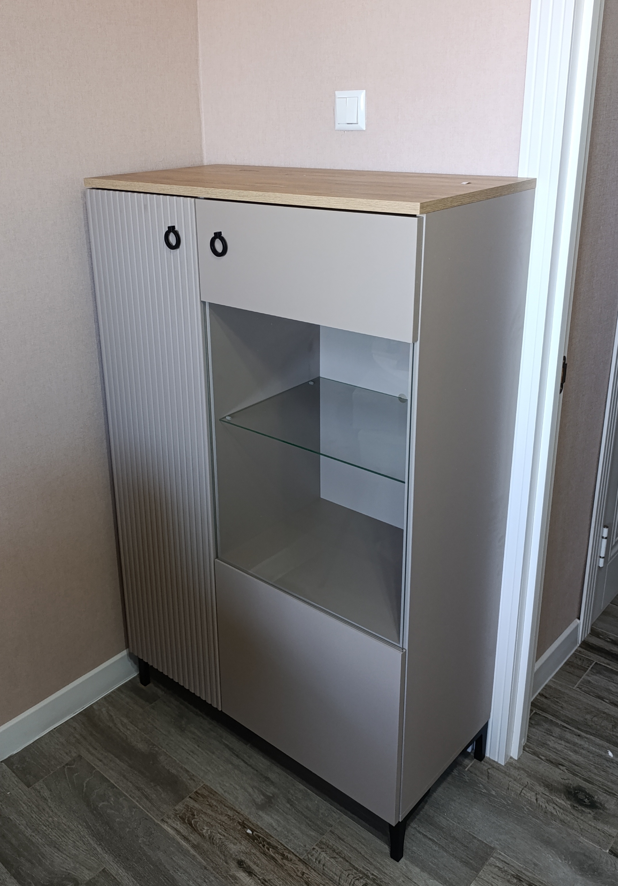 - Справа — 1 распашная дверь со стеклянной вставкой; за дверью расположено 3 отделения для хранения;